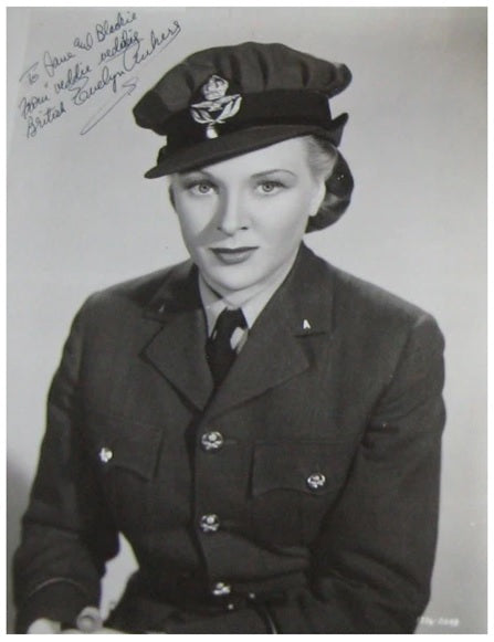 Scarce vintage 8x10-inch black and white publicity portrait from the 1942 World War II flick The Great Impersonation, boldly signed and inscribed to Pentagon Library owner and horror guru Blackie Seymour and his wife, referring to herself as "veddie veddie British," as a nod to her role in the film. In good condition. Best known for her portrayal of Gwen Conliffe in The Wolf Man (1941), opposite Lon Chaney, Jr., beautiful Chilean-born British scream queen Evelyn Ankers made many other key contributions to the horror and sci-fi genres, playing Norma Lind in Hold That Ghost (1941), Elsa Frankenstein in The Ghost of Frankenstein (1942), Beth Colman in Captive Wild Woman (1943), Claire Caldwell in Son of Dracula (1943), Isabel Lewis in The Mad Ghoul (1943), Ilona Carr in Weird Woman (1944), Beth Mason in Jungle Woman (1944), Julie Herrick in The Invisible Man’s Revenge (1944), and Maura Daniel in The Frozen Ghost (1945).