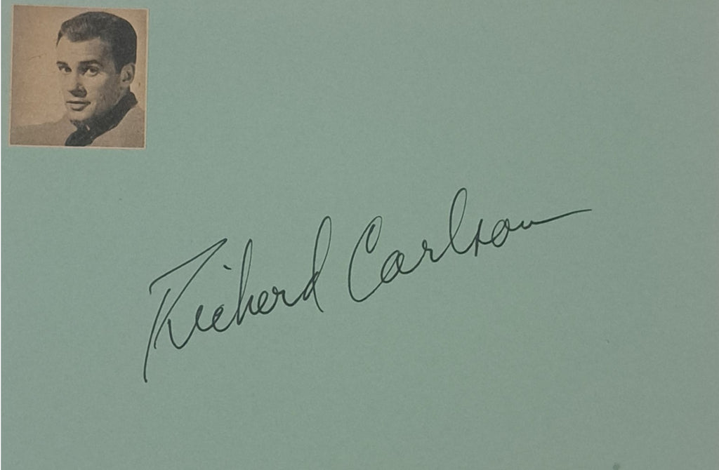 Scarce vintage black fountain pen signature on a 4x6-inch light blue card, acquired in-person by an inveterate autograph hound in the 1960s and decorated with a small Players Directory image. In good condition. After memorable work in The Ghost Breakers and Hold That Ghost (1941), stage and screen star Richard Carlson took a hiatus from acting to serve in the Second World War. Upon his return, he found solid work more difficult to come by, and found himself increasingly relegated roles in B-level horror, sci-fi, fantasy, and crime flicks. Among the memorable of these were Behind Locked Doors (1948); The Amazing Mr. X (1948); The Magnetic Monster (1953); the 3-D cult favorites The Maze (1953), It Came from Outer Space (1953) and The Creature from the Black Lagoon (1954); Riders to the Stars (1954); Tormented (1960); The Power (1968); and The Valley of Gwangi (1969). He was also memorable in the Elvis Presley musical Change of Habit in 1969.