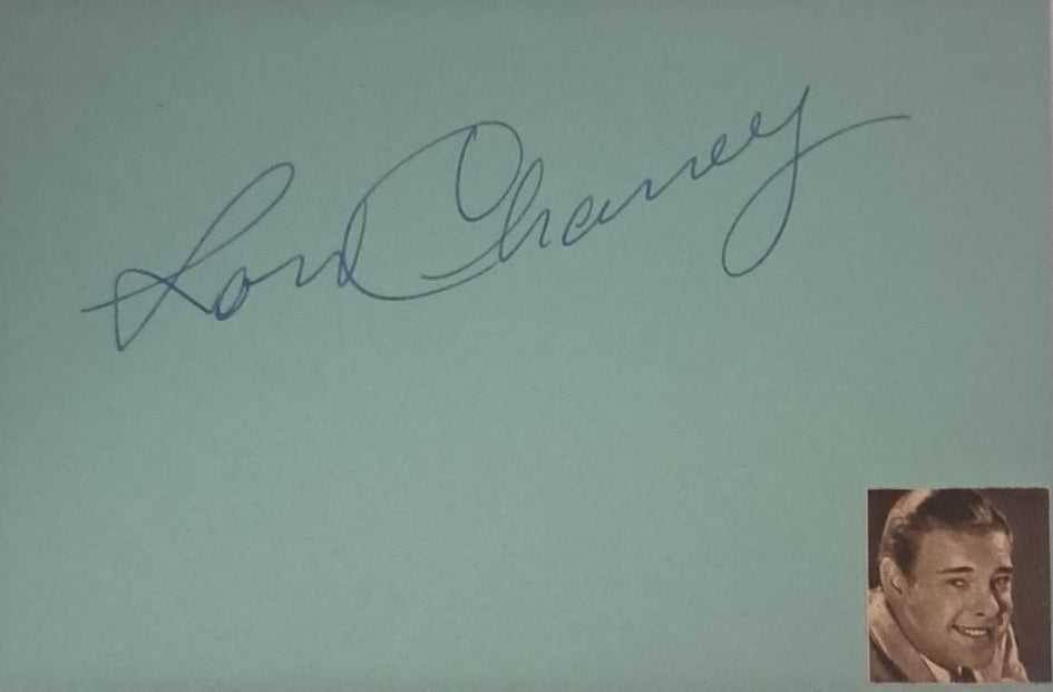 Rare and quite perfect vintage blue fountain pen signature, ideal for matting with a favorite photograph, on a 4x6-inch light green card, acquired in-person by unstoppable autograph hound John Virzi in the 1960s and decorated with a small Players Directory image of the star. In good condition. Carrying on his father's legacy, Lon Chaney, Jr. was a bona fide icon of the horror, science-fiction and fantasy genres, channeling his personal battle with chronic alcoholism into the role of the tormented lycanthrope Larry Talbot in The Wolf Man (1941). He reprised the role in Frankenstein Meets the Wolf Man (1943), House of Frankenstein (1944), House Of Dracula (1945), and Abbott and Costello Meet Frankenstein (1948), and was also memorable as Captain Hakur in Undersea Kingdom (1936); the Monster in The Ghost of Frankenstein (1942); Kharis in The Mummy’s Tomb (1942), The Mummy’s Ghost (1944) and The Mummy’s Curse (1944); the Count in Son of Dracula (1943); Dr. Steel in Calling Dr. Death (1943); Professor Reed in Weird Woman (1944); Bear in Ghost Catchers (1944); the blind artist in Dead Man’s Eyes (1944); Alex Gregor in The Frozen Ghost (1944); Jeffrey Carter in Strange Confession (1945); Wayne Fletcher in Pillow of Death (1946); The invulnerable Butcher in Indestructible Man (1956); Dr. Munroe in The Black Sheep (1956); Martin Melville in The Cyclops (1957); Manon in The Alligator People (1959); the werewolf in La Case del Terror (1960); Satan in The Devil’s Messenger (1961); Simon Orne in The Haunted Palace (1963); the mummified wolf man in Face of the Screaming Werewolf (1963); Morgan Whitlock in Witchcraft (1964); Belial Desard in House of the Black Death (1965); Dr. Mendell in Dr. Terror’s Gallery of Horrors (1967); Bruno in Spider Baby (1968); and Groton in Dracula vs. Frankenstein (1971).