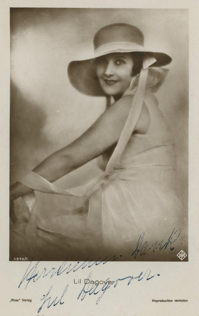 Vintage 3.25 x 5.25-inch sepia-tone German "Ross" Verlag postcard portrait, boldly signed in black fountain pen, circa 1925. In good condition. Lovely West Indian-born silent movie queen Lil Dagover is remembered by horror, sci-fi and fantasy buffs for her starring role as Jane Olsen in Robert Wiene's The Cabinet of Dr. Caligari (1920).