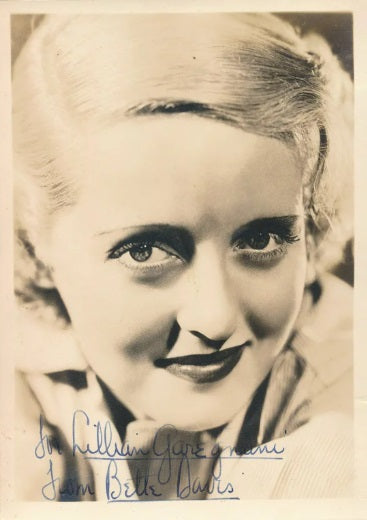 Uncommonly early 5x7-inch sepia-tone portrait, boldly signed and inscribed in blue fountain pen at the very onset of her film career in the early 1930s, when her sister was signing most "autographs" for fans through the mail. In good condition for its age. Tempestuous, chain-smoking, two-time Oscar-winning stage and screen star Bette Davis headlined in some of Hollywood's most beloved classics, including Of Human Bondage (1934), The Petrified Forest (1936), Satan Met a Lady (1936), Jezebel (1938), Dark Victory (1939), Juarez (1939), The Old Maid (1939), Essex and Elizabeth (1939), All This, and Heaven Too (1940), The Letter (1940), The Great Lie (1941), Shining Victory (1941), The Little Foxes (1941), The Man Who Came to Dinner (1942), In This Our Life (1942), Now, Voyager (1942), Old Acquaintance (1943), Mr. Skeffington (1944), The Corn Is Green (1945), A Stolen Life (1946), Beyond the Forest (1949), All About Eve (1950), The Star (1952), The Virgin Queen (1952), Pocketful of Miracles (1961), and the cult favorite Whatever Happened to Baby Jane? (1962). No longer leading lady material by the early 1960s, she made ends meet with roles in a number of horror, sci-fi and fantasy flicks, including Dead Ringer (1964), Hush... Hush, Sweet Charlotte (1964), Scream, Pretty Peggy (1973), Burnt Offerings (1976), and The Watcher in the Woods (1980).
