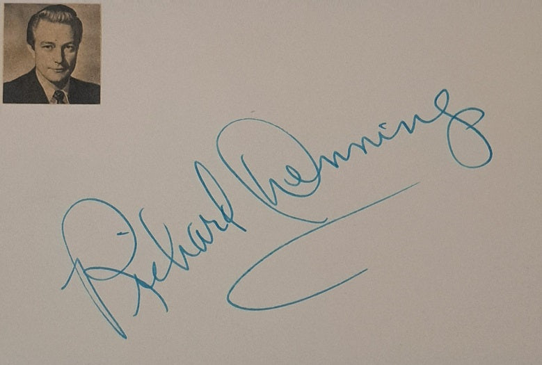 Uncommon vintage turquoise fountain pen signature on a 4x6-inch off-white card, acquired in-person by inveterate autograph hound John Virzi in the 1960s and decorated with a small Players Directory image. In good condition.Authoritative leading man Richard Denning, who was the longtime husband of scream queen Evelyn Ankers, starred in a long string of horror, sci-fi and fantasy flicks, including Television Spy (1939), Beyond the Blue Horizon (1942), Unknown Island (1948), Creature from the Black Lagoon (1954), Target Earth (1954), Creature with the Atom Brain (1955), Day the World Ended (1955), The Black Scorpion (1957), and Twice-Told Tales (1963). Weary of B-level fare, he abandoned his film career in the 1970s, but over the course of three decades, had a recurring role as Governor Paul Jameson on T.V.'s "Hawaii Five-O" (1968-1980).
