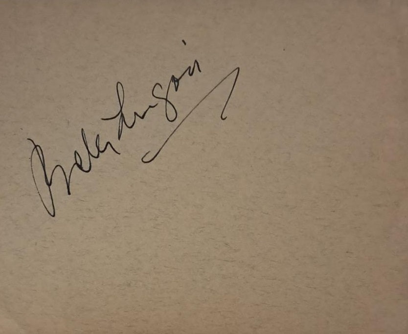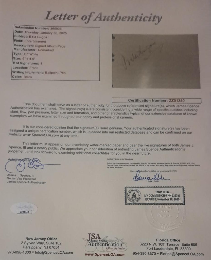 Fang-tastic vintage mattable black fountain pen signature on a 4x6-inch tan album page, acquired in-person in the 1950s. In good condition, with a ragged left edge, where it was removed from the original autograph book, and accompanied by a letter from the third-party authentication service J.S.A. In good condition for its age. Iconic Hungarian stage and screen star Bela Lugosi will forever be associated with his portrayal of the titular bloodsucker in Tod Browning's Dracula (1931), a role he would reprise in Abbott and Costello Meet Frankenstein in 1948. He was also chilling as Inspector Delzante in The Thirteenth Chair (1929), Dr. Mirakle in Murders in the Rue Morgue (1932), Murder Legendre in White Zombie (1932), Roxor in Chandu the Magician (1932), the Sayer of the Law in Island of Lost Souls (1932), Degar inNight of Terror (1933), Dr. Verdegast in The Black Cat (1934), Chandu in The Return of Chandu (1934), Count Mora in Mark of the Vampire (1934), Anton Lorenzen in Phantom Ship (1934), Dr. Vollin in The Raven (1934), Dr. Perry in Murder by Television (1935), Dr. Benet in The Invisible Ray (1936), Ygor in Son of Frankenstein(1939), Peters the butler in The Gorilla (1939), Dr. Zorka in The Phantom Creeps (1939), Dr. Orloff in The Human Monster (1939), Eric Marnay in Black Friday (1940), Dr. Carruthers in The Devil Bat (1940), Dr. Kessler in Invisible Ghost (1941), Eduardo Vivos in The Black Cat (1941), Ygor in The Ghost of Frankenstein (1942), Dr. Lorenz in The Corpse Vanishes (1942), Rolf in Night Monster (1942), Professor Brenner in Bowery at Midnight (1942), Dr. Brewster in The Ape Man (1942), Frankenstein’s monster in Frankenstein Meets the Wolf Man (1943), Emil in Ghosts on the Loose (1943), Armand Tesla and Dr. Bruckner in Return of the Vampire (1944), Dr. Marlowe in Voodoo Man (1944), Professor Dexter in Return of the Ape Man (1944), Merkil in One Body Too Many (1944), Dr. Renault in Zombies on Broadway (1945), Joseph in The Body Snatcher (1945), Von Housen in My Son, the Vampire (1952), Dr. Zabor in Bela Lugosi Meets a Brooklyn Gorilla (1952), Dr. Vornoff in Bride of the Monster (1955), and a ghoul in Plan Nine from Outer Space (1959).