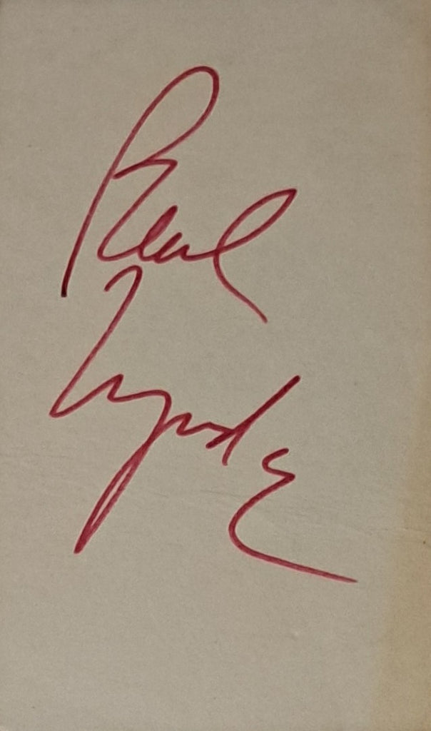 Scarce vintage signature in red felt-tip pen on a 3x5-inch tan card, acquired in-person by a busy autograph hound in the 1970s. In good condition.With his distinct drawl, stinging barbs and sexually-charged innuendos, comic actor and gay icon Paul Lynde stole every scene in films like Bye Bye Birdie (1963), Send Me No Flowers (1964), Beach Blanket Bingo (1965), and Rabbit Test (1978). His extensive work on television included classic episodes of "The Munsters" (1964-1965), "Bewitched" (1965-1971) and "I Dream of Jeannie" (1966-1968), as well as "The Paul Lynde Show" (1972-1973) and a long run on the game show "The Hollywood Squares" (1966-1979). He died tragically of a drug abuse-related heart attack at the age of 55 and his autograph is rather elusive in any format.