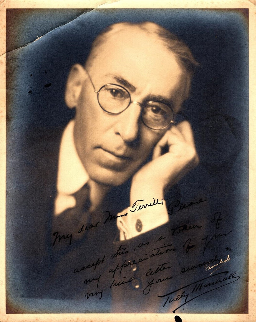 EXTREMELY rare vintage 8x10-inch sepia-tone portrait, boldly signed and inscribed in the 1920s. In fine condition for its age, with a diagonal crease to the upper left-hand area, some surface scuffs and light silvering, but so impossible to find as to render these flaws negligible. Tully Marshall, cadaverous character actor of the stage, and silent and early talkie screens, played a motley crew of drunken trail scouts, lovable grandpas, unforgiving fathers, sinister attorneys, and lecherous aristocrats. He was memorable as the High Priest in D.W. Griffith's Intolerance (1916), Count Mancini in the Lon Chaney classic He Who Gets Slapped (1924), Roger Crosby in Paul Leni's silent horror classic The Cat and the Canary (1927), William Townsend in The Gorilla (1927), the Ambassador in The Mysterious Dr. Fu Manchu (1929), Muff Potter in Tom Sawyer (1930), Robert Daniels in the thrilled Strangers in the Evening (1932), Richard Rinehart in the early Bela Lugosi flick Night of Terror (1933), and wheelchair-bound criminal mastermind Alvin Brewster in This Gun for Hire (1942). He also appeared in over 50 silent and early talkie comedy shorts and full-length features, including The Slim Princess (1920) with Mabel Normand.