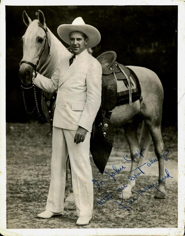 Scarce vintage 8x10-inch black and white portrait of the beloved western star of the silent and early talkie eras, shown in cowboy attire with his palomino "Wonder Horse," Tarzan, boldly signed and inscribed in blue fountain pen in the late 1930s. In good condition for its age, with a few minor handling dings.