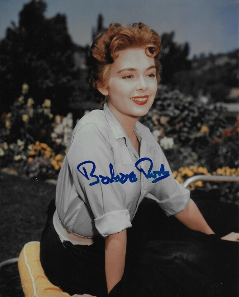 Gorgeous 8x10-inch color portrait in her prime, boldly signed in blue felt-tip marker in-person at a film convention appearance in her later years. In good condition. Poised, graceful Barbara Rush is remembered by horror, sci-fi and fantasy buffs for her starring roles as Joyce Hendron in When Worlds Collide (1951), Ellen Fields in It Came from Outer Space (1953) and glamorous villainess Nora Clavicle on T.V.'s "Batman" (1968). Her credits in other genres included Magnificent Obsession (1954), Kiss of Fire (1955), Bigger Than Life (1956), The Young Lions (1958), Come Blow Your Horn (1963), Robin and the 7 Hoods (1964), "Peyton Place" (1968-1969), "Flamingo Road" (1980-1982), and "7th Heaven" (1997-2007).