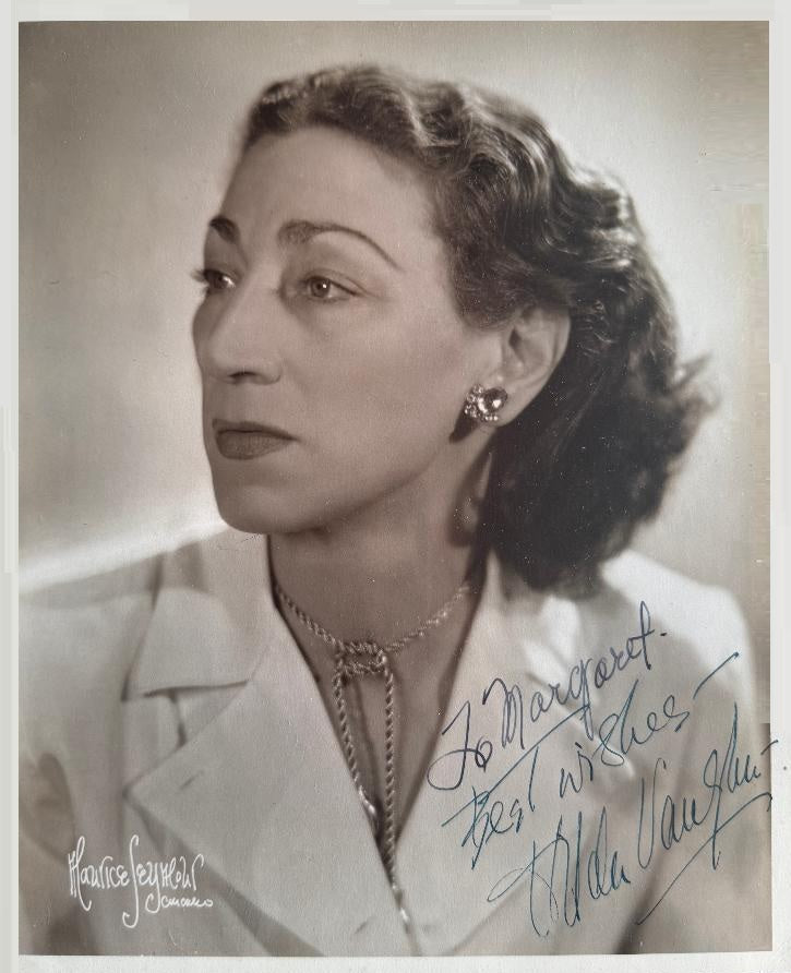 Highly rare vintage 8x10-inch color portrait by Maurice Seymour, boldly signed and inscribed in blue fountain pen in the 1930s. In good condition for its age and just the third we have ever offered. Scrawny, tart-tongued character actress Hilda Vaughn excelled at playing untrustworthy or generally unpleasant maids, charwomen, governesses, and salesladies in films of the 1930s through 1950s.  Before being blacklisted by the McCarthy witch hunt of the 1950s and her early death of a heart attack at the age of 59, she was unforgettable as Jean Harlow's backmailing domestic in Dinner at Eight (1933), and in classic films like Three Live Ghosts (1929), Susan Lenox (1931), The Phantom of Crestwood (1932), Anne of Green Gables (1934), The Wedding Night (1935), The Trail of the Lonesome Pine (1936), The Witness Chair (1936), Charlie Chan at the Opera (1936), Maid's Night Out (1938), and Charlie Chan at the Wax Museum (1940).