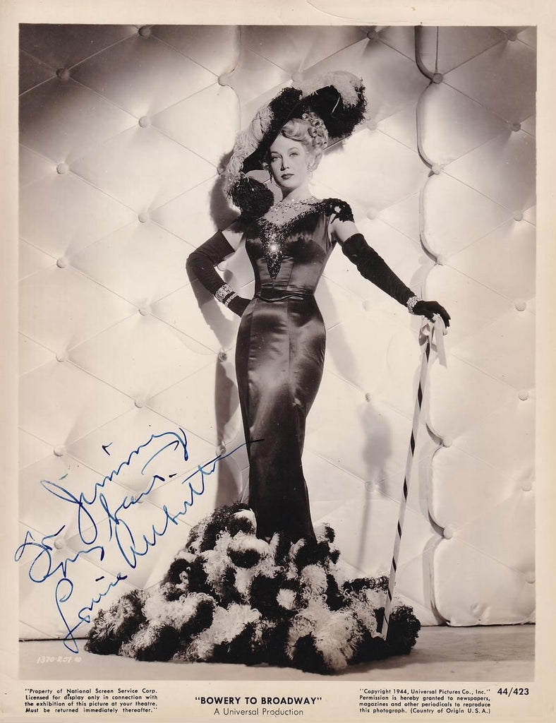 Scarce and beautiful vintage 8x10-inch black and white portrait as stage icon Lillian Russell in Bowery to Broadway (1944), boldly signed and inscribed for reporter Jimmy Starr in the period of the film. In fine condition for its age, with scattered light creasing to the surface and borders. Before her untimely death of cancer at age 58, gorgeous B-movie favorite Louise Allbritton starred as Katherine Caldwell in the horror, sci-fi and fantasy classic Son of Dracula (1943), and was elsewhere memorable in the Abbott and Costello flick Who Done It? (1942), Crazy House (1943), The Egg and I (1947), and Sitting Pretty (1948).