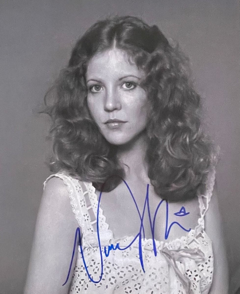 8x10-inch black and white portrait of the pretty, blonde leading actress as devious, prom-crashing Chris Hargensen in Carrie (1976), boldly signed in blue felt-tip marker in-person at a film convention appearance about a decade ago. In very good condition.