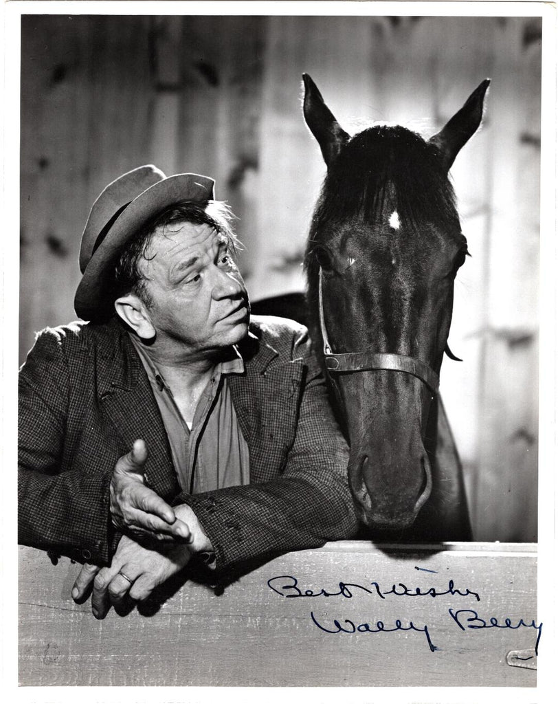 Tough to acquire vintage 8x10-inch black and white portrait from Stablemates (1938), boldly signed in black fountain pen in the period of the film. In good condition, with minor edgewear. Large-and-in-charge Wallace "Wally" Beery, who snagged an Oscar for 1931's The Champ, signed very few autographs, despite his enormous fame and popularity.