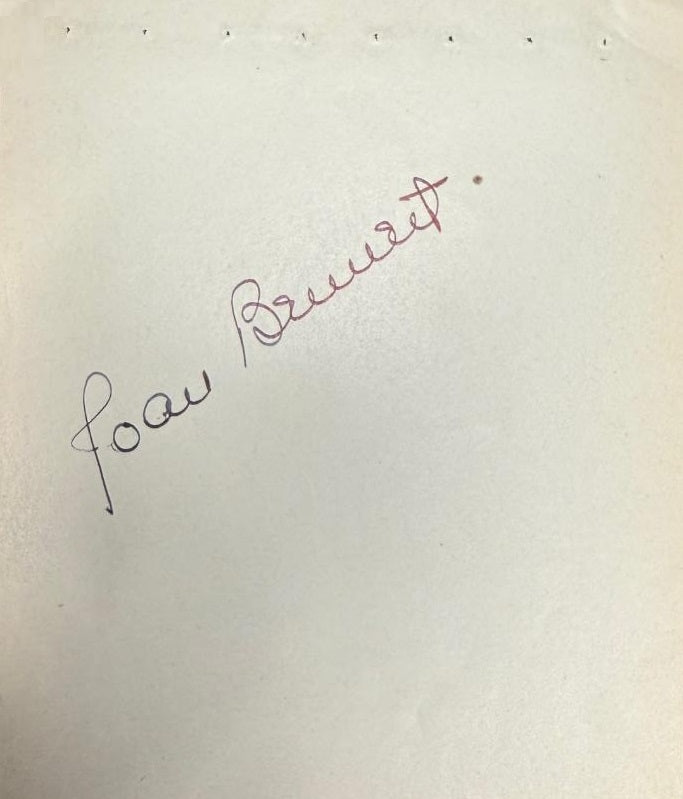 Perfect uninscribed mattable signature in violet fountain pen on a 4x6-inch tan autograph album page, acquired in-person in the 1930s. In good condition. Born of a long line of actors, dating to the 18th century, Joan Bennett made her Hollywood debut alongside her parents and two sisters in The Valley of Decision (1916), aged only five. After a long hiatus, she returned to the screen in the early 1930s, headlining in enjoyable programmers like Me and My Gal (1932), Little Women (1933) and Pursuit of Happiness (1934). While always popular with audiences, it wasn't until she dyed her blonde hair jet black for a role in Trade Winds (1938) that she achieved bona fide icon status, thriving in "dark" bad girl roles throughout the 1940s. She was especially effective in a series of melodramas directed by Fritz Lang: Man Hunt (1941), The Woman in the Window (1944), Scarlet Street (1945), and The Secret Beyond the Door (1948). In 1950, she again switched professional gears, abandoning femme-fatale roles for the part of Spencer Tracy's ever-patient spouse in Father of the Bride (1950). Later in life, she made several contributions to the horror, sci-fi and fantasy genres, starring on T.V.'s "gothic" soap opera "Dark Shadows" (1965-1971), and in House of Dark Shadows (1970), Dario Argento's Suspiria (1977), and This House Possessed (1981).
