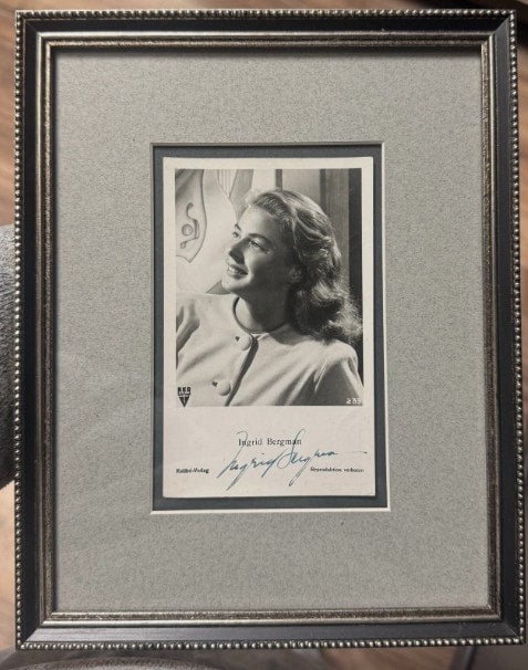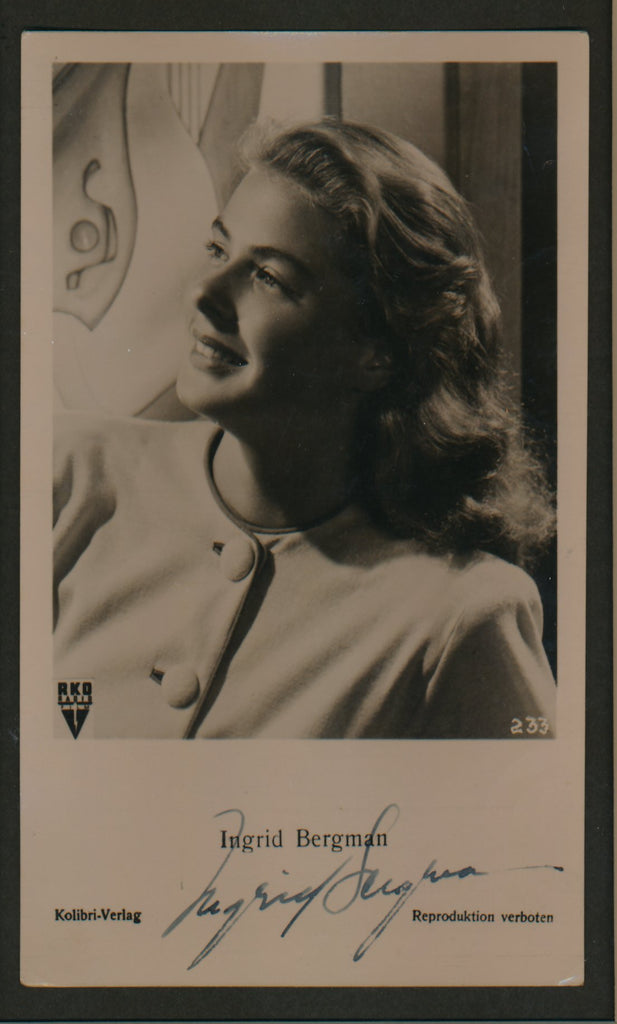 Scarce and luminous 3.5 x 5.75-inch black and white German postcard portrait, boldly signed with her name alone in blue fountain pen in the 1940s and handsomely matted and framed to an overall size of 8 x 10.25 inches. In good condition and charming for display. Famed for her saintly, natural beauty, Ingrid Bergman was arguably the most popular actress of the 1940s, equally adored by audiences and critics. After establishing herself as a leading lady par excellence on film and in the theater in her native Sweden, she was invited to Hollywood by David O. Selznick to star in the English-language version of Intermezzo: A Love Story in 1939. She went on a long string of blockbuster performances, unforgettable in the horrorclassic Dr. Jekyll and Mr. Hyde (1941), Casablanca (1942), For Whom the Bell Tolls (1943), Gaslight (1944), The Bells of Saint Mary's (1945), Spellbound (1945), Notorious (1946), Joan of Arc (1948), Under Capricorn (1949), Anastasia (1956), The Inn of the Sixth Happiness (1958), Murder on the Orient Express (1974), and Autumn Sonata (1978), racking up a whopping three Best Actress Academy Awards.