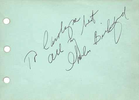 Scarce vintage inscribed black fountain pen signature on a 4x6-inch turquoise autograph album page, acquired in-person in the 1930s. In good condition for its age. Gruff character actor Charles Bickford was a man to be reckoned with: At age nine, he was tried and acquitted for the attempted shooting of a motorist who had run over his dog; he spent his teen years as a vagabond, making ends meet by keeping company with a burlesque dancer; he fought endlessly with Louis B. Mayer following a contract with MGM; and he was mauled by a lion while filming East of Java in 1935, resulting in extensive neck scarring. Perhaps understandably of a brusque and cranky disposition, he established himself as one of Hollywood's most distinguished character actors, earning three Oscar nods for a terrific body of work which included Greta Garbo’s Anna Christie (1930), The Squaw Man (1931), The Farmer Takes A Wife (1935), The Plainsman (1936), Of Mice And Men (1939), Reap The Wild Wind (1942), The Song of Bernadette (1943), Duel in the Sun (1946), Johnny Belinda (1948), A Star is Born (1954), The Big Country (1958), and Days of Wine and Roses (1962).
