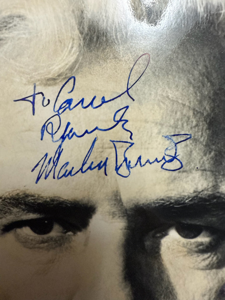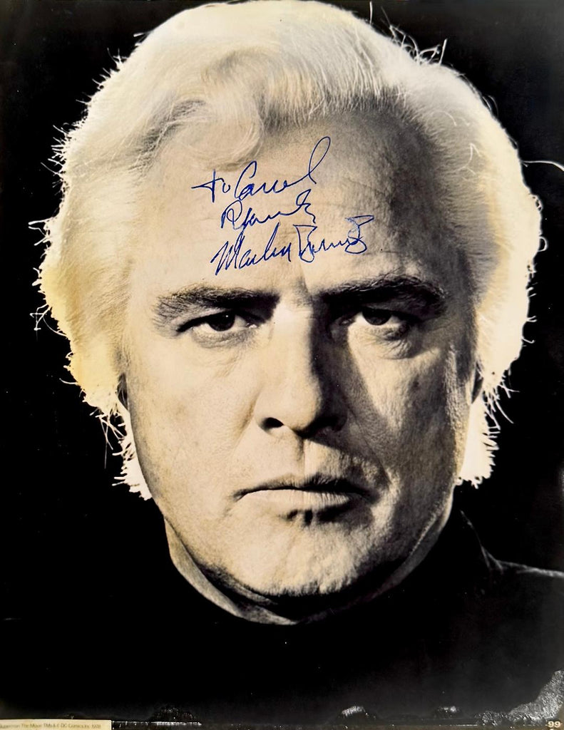 Previously sold by Adam Partridge Auctioneers in the U.K.: Extremely rare vintage 8x10-inch portrait of the iconic, autograph-evading star as Jor-El, father of the titular Man of Steal, in 1978's Superman, boldly signed and inscribed in blue fountain pen in the period of the film. In fine condition, with an original studio snipe affixed to the verso; some minor edgewear and surface crinkling; silvering to the lower right-hand corner; and gentle brushing to the ink at the end of his surname. A RARE authentic and eminently display-worthy example! Enigmatic two-time Oscar-winner Marlon Brando brought gripping realism to classic films like A Streetcar Named Desire (1951), Viva Zapata! (1952), Julius Caesar (1953), The Wild One (1953), On the Waterfront (1954), Reflections in a Golden Eye (1967), The Godfather (1972), Last Tango in Paris (1972), and Apocalypse Now (1979).He is also remembered by sci-fi and fantasy fans for his roles in Superman (1978) and The Island of Dr. Moreau (1996).