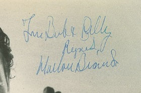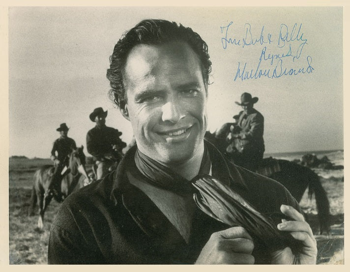 Previously sold at RR Auction: Extremely rare vintage matte-finish 10x8-inch portrait, shown smiling for the camera during filming of 1961's One-Eyed Jacks, his lone directorial venture, boldly signed and inscribed in blue ballpoint in the period of the film. In good condition, with creasing to lower corner and a professional border repair. A RARE authentic and eminently display-worthy example of the star's autograph! Iconic two-time Oscar-winner Marlon Brando brought gripping realism to classic films like A Streetcar Named Desire (1951), Viva Zapata! (1952), Julius Caesar (1953), The Wild One (1953), On the Waterfront (1954), Reflections in a Golden Eye (1967), The Godfather (1972), Last Tango in Paris (1972), and Apocalypse Now (1979). He is also remembered by sci-fi and fantasy fans for his roles in Superman (1978) and The Island of Dr. Moreau (1996).