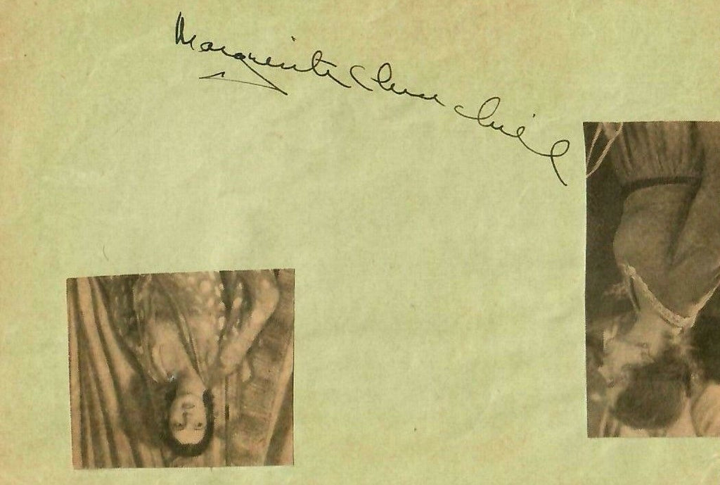 Highly rare vintage blue fountain pen signature on a 4x6-inch olive green autograph album page, acquired in-person in the 1930s and decorated with two magazine images of the star. In good condition for its age. There is a small sticker from the third-party authentication service J.S.A. affixed to the verso. After a brief Broadway stage career, raven-haired Marguerite Churchill was signed to a film contract by Fox Studios, making her debut in The Valiant (1929), opposite Paul Muni. Chiefly relegated to B-pictures like Born Reckless (1930), Charlie Chan Carries On (1931), Legion of Terror (1936), and Man Hunt (1936), she headlined in two horror classics in 1936, playing Nancy in the Bela Lugosi and Boris Karloff flick The Walking Dead, and Janet Blake in Lambert Hillyer's cult favorite Dracula's Daughter. Following a few more appearances that same year, she abandoned Hollywood to raise a family with actor George O'Brien, resurfacing only once following their 1948 divorce, to star in RKO's horror-themed mystery Bunco Squad (1950). Although she lived until 2000, this is one of only a handful of autographs of the actress we've ever encountered.