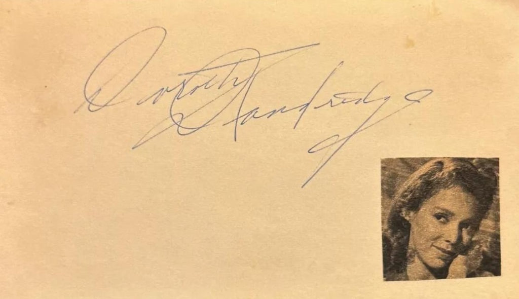 Highly rare vintage signature in blue ballpoint pen on a 3x5-inch tan card, acquired in-person by an inveterate autograph hound in the 1950s and decorated with a small Players Directory image of the star. In good condition. Gorgeous singer and film star Dorothy Dandridge was the first African-American to be nominated for the Best Actress Academy Award, for Carmen Jones in 1954. Five years later, she earned further accolades for her title role in the film adaptation of George Gershwin's Porgy and Bess (1959). Dandridge committed suicide by an overdose of antidepressants at age 42 and her autograph is elusive in any format.