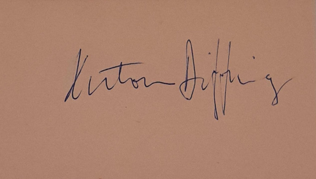 Scarce vintage blue ballpoint pen signature on a 3x5-inch orange autograph album page of the prolific British actor who who was typically cast as Nazis and other villains, acquired in-person by an inveterate autograph hound in the 1970s. In good condition, with slight trimming.