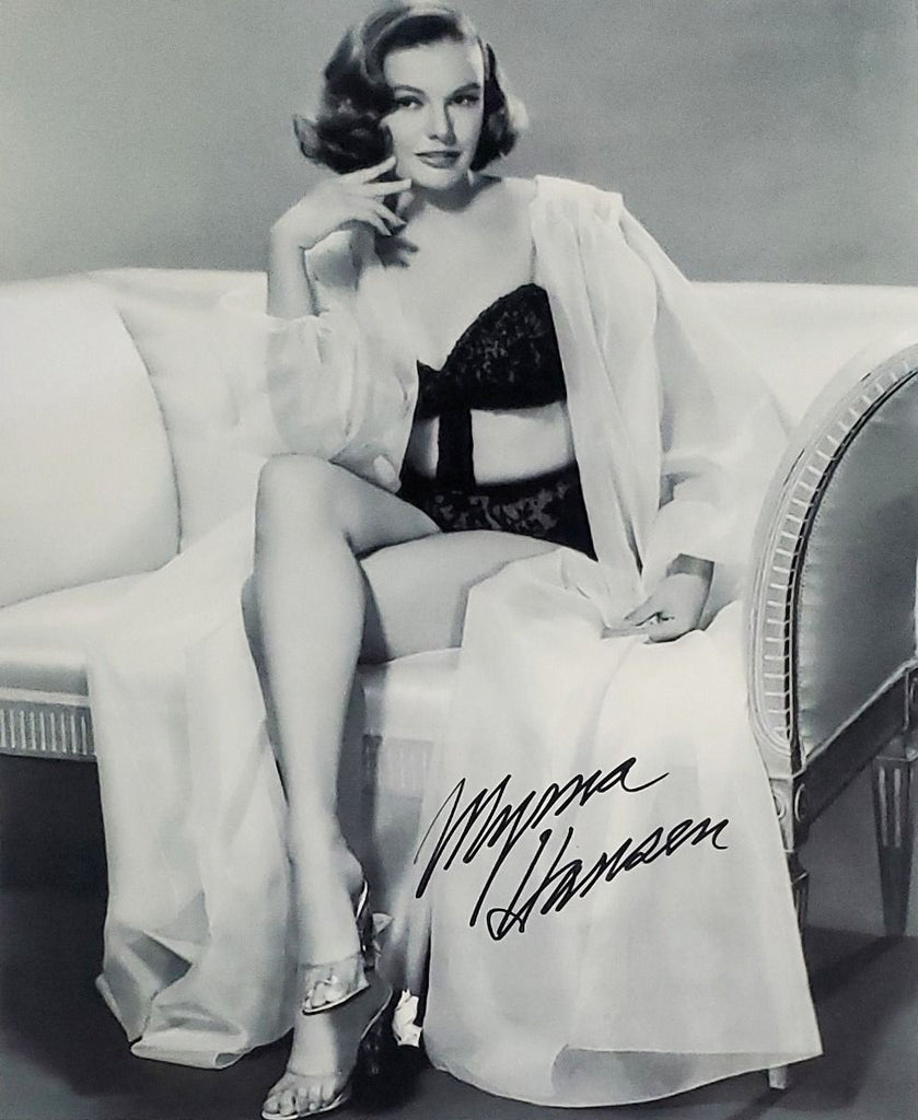 Scarce 8x10-inch black and white portrait, looking gorgeous and leggy in her prime, boldly signed in black felt-tip marker in her later years. In good condition. Beautiful model Myrna Hansen snagged the Miss Universe title in 1953 and went on to a film career, including including Magnificent Obsession (1954), Man Without a Star (1955), Cult of the Cobra (1955), The Purple Mask (1955), and There's Always Tomorrow (1956).