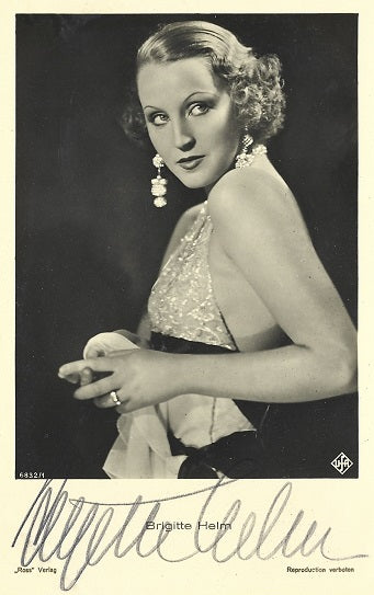 Scarce vintage 3.25 x 5.25-inch German Ross Verlag postcard portrait, boldly signed in thick black pencil, as was sometimes her custom, around the time of Metropolis (1927). In good condition, with a rubberstamped owner's label on the verso. Best remembered for her portrayal of Maria, the Maschinenmensch,in Fritz Lang's dystopian classic Metropolis (1927), lovely German silent and early talkie film star Brigitte Helm made several other contributions to the horror, sci-fi and fantasy genres, portraying Alraune ten Brinken in A Daughter of Destiny (1928) and Alraune (1930); Antinea in Georg Wilhelm Pabst's L'Atlantide (1932), Queen of Atlantis (1932) and The Lost Atlantis (1932); and Florence Wills in Gold (1934).
