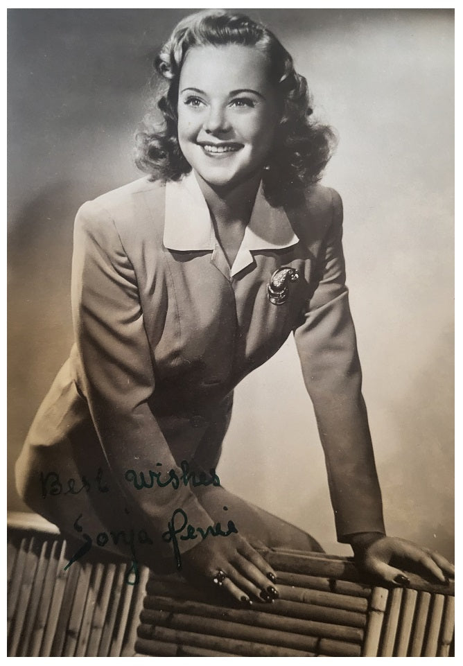 Scarce 5x7-inch sepia-tone publicity portrait, boldly autographed in green fountain pen, with the signing date of 8/9/43 recorded on the verso. In good condition for its age. Beloved Norwegian Olympian ice skater and film star Sonja Henie died tragically of leukemia at the age of 57 and her autograph is rather elusive in any format.