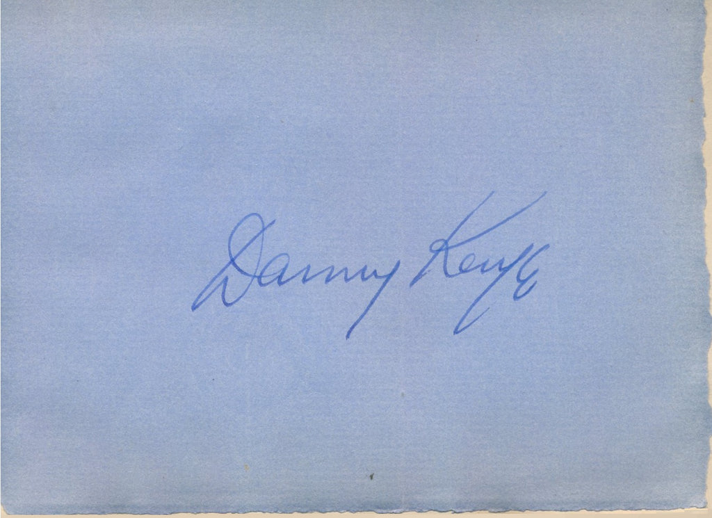 Uncommonly early blue fountain pen signature on a 3.25 x 4.25-inch light blue autograph album page, acquired in-person in the 1940s and affixed to a slightly larger leaf. In good condition and suitable for matting with a favorite photograph. Song and dance man Danny Kaye was something of a comedic genius, delighting audiences with his tongue-twisting tunes and monologues in a wide variety of dialects.  Samuel Goldwyn had been trying to sign him to a movie contract for years before he finally agreed, and he was featured in a series of Technicolor musicals, including Up in Arms (1944).  He went on the charming work in Wonder Man (1945), The Kid from Brooklyn (1946), The Secret Life of Walter Mitty (1947), A Song Is Born (1948), The Inspector General (1949), Hans Christian Andersen (1952), White Christmas (1954), and The Court Jester (1955).