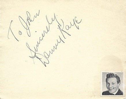 Vintage inscribed black fountain pen signature on a 4x6-inch tan autograph album page, acquired in-person in the 1940s and decorated with a small Players Directory image of the star. In good condition for its age. Song and dance man Danny Kaye was something of a comedic genius, delighting audiences with his tongue-twisting tunes and monologues in a wide variety of dialects. Samuel Goldwyn had been trying to sign him to a movie contract for years before he finally agreed, and he was featured in a series of Technicolor musicals, including Up in Arms (1944). He went on the charming work in Wonder Man (1945), The Kid from Brooklyn (1946), The Secret Life of Walter Mitty (1947), A Song Is Born (1948), The Inspector General (1949), Hans Christian Andersen (1952), White Christmas (1954), and The Court Jester (1955).