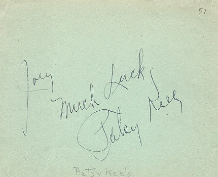 Uncommon vintage inscribed black fountain pen signature on a 4x6-inch light green autograph album page, acquired in-person in the 1930s. In good condition for its age. There was no forgetting Patsy Kelly, with her dumpy looks, loud mouth, brash mannerisms, and heavy Brooklyn accent. In 1933, Hal Roach lured her away from the New York City stage to Hollywood, to replace ZaSu Pitts as Thelma Todd's costar in a popular series of two-reel comedies. Over the next decade, she sustained a busy screen career, often playing the deadpan, wisecracking friend of the heroine. She retired after 1943, reportedly due to heavy drinking, and, years later, would popped up as a member of the Castavets' coven in Roman Polanski's horror classic, Rosemary's Baby (1968).