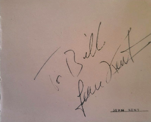 Uncommon vintage inscribed black fountain pen signature on a roughly 3x4-inch pink autograph album page, acquired in-person in the early 1940s. In good condition. Vivacious, hazel-eyed, strawberry-haired Jean Kent was a popular British star of of the 1940's and early 1950's, memorable as juicy scarlet women and imperious wenches in like Man of Evil (1944), The Wicked Lady (1945), Caravan (1946), Good-Time Girl (1948), Five Angles on Murder (1950), The Browning Version (1951), The Prince and the Showgirl (1957), horror's The Haunted Strangler (1958) with Boris Karloff, Sir Francis Drake (1961), Steptoe and Son (1962), and Crossroads (1964).