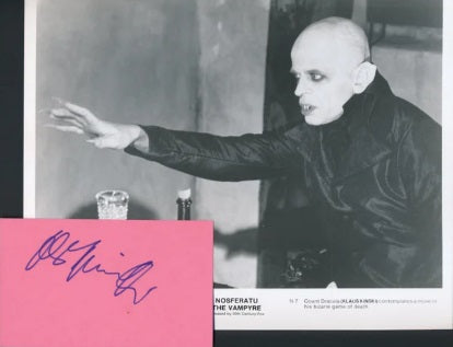 Extremely uncommon vintage full-name signature-- He usually only signed "Kinski" and is rare even in that format!-- on a 3x5-inch pink card, acquired in-person in 1979, the year in which he starred as the titular bloodsucker in Nosferatu the Vampyre (1979). In good condition and ideal for matting, accompanied by a 10x8-inch black and white restrike still from that horror classic. Temperamental German-born cult favorite Klaus Kinski is best remembered for his association with Werner Herzog, for whom he starred in Aguirre, the Wrath of God (1972), Nosferatu the Vampyre (1979), Woyzeck (1979), Fitzcarraldo (1982), and Cobra Verde (1987). He was also noteworthy in a number of spaghetti westerns, including For a Few Dollars More (1965), A Bullet for the General (1966), The Great Silence (1968), And God Said to Cain (1970), Shoot the Living and Pray for the Dead (1971), and A Genius, Two Partners and a Dupe (1975). He died of a heart attack at the age of 65.