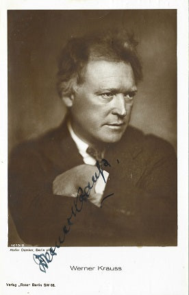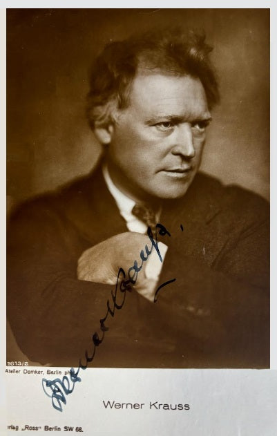 Scarce vintage 3.5 x 5.5-inch sepia-tone postcard portrait, boldly signed in black fountain pen around 1925. In fine condition for its age, with minor surface scuffs. Veteran Austrian stage, and silent and early talkie screen star Werner Krauss specialized in playing complex, obsessive and tortured characters. The peerless villain actor of the German expressionist genre was unforgettable in the title role of the horror classic The Cabinet of Dr. Caligari (1920); as Jack-the-Ripper and Spring-heeled Jack in Waxworks (1924); and as the mephistophelean Scapinelli in The Man Who Cheated Life (1926).