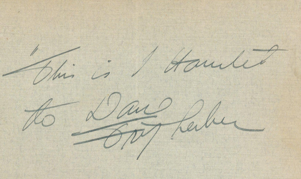 Rare vintage inscribed black fountain pen signature on a roughly 4x5-inch grey autograph album page, dating to the early 1930s. In good condition, referencing "Hamlet," one of his most noted stage roles. Famed Shakespearian stage actor Fritz Leiber, Sr., made a successful transition to the screen in 1917, playing kings, emperors, physicians, priests, and other men of authority for over 30 years. He is fondly remembered by fans of the horror, sci-fi and fantasy genres for his portrayals of an old nobleman in The Hunchback of Notre Dame (1939), Franz Lizst in Phantom of the Opera (1943), Dr. Charles Morris in Cry of the Werewolf (1944), and Venreau in Cobra Woman (1944). Elsewhere, he was a veritable scene-stealer in A Tale of Two Cities (1935), The Prince and the Pauper (1937), The Way of All Flesh (1940), All This, and Heaven Too (1940), Scarlet Street (1945), Another Part of the Forest (1948), and Samson and Delilah (1949).