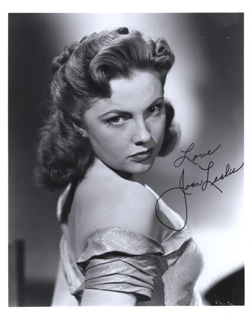 Youthful 8x10-inch black and white portrait in her prime, boldly signed in black felt-tip pen in her later years. In good condition. Charming Joan Leslie was one of the loveliest leading ladies of the 1940s, memorable in classic films like High Sierra (1941), Sergeant York (1941) and Yankee Doodle Dandy (1942).