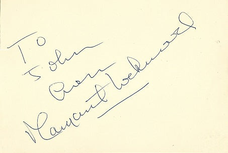 Vintage inscribed blue ballpoint pen signature on a 4x6-inch tan autograph album page, acquired in-person in the 1950s. In good condition. Beautiful Margaret Lockwood was one of Great Britain's most popular film stars of the 1930s and 1940s, memorable in classics like The Lady Vanishes (1938), Night Train to Munich (1940), The Man in Grey (1943), and The Wicked Lady (1945).