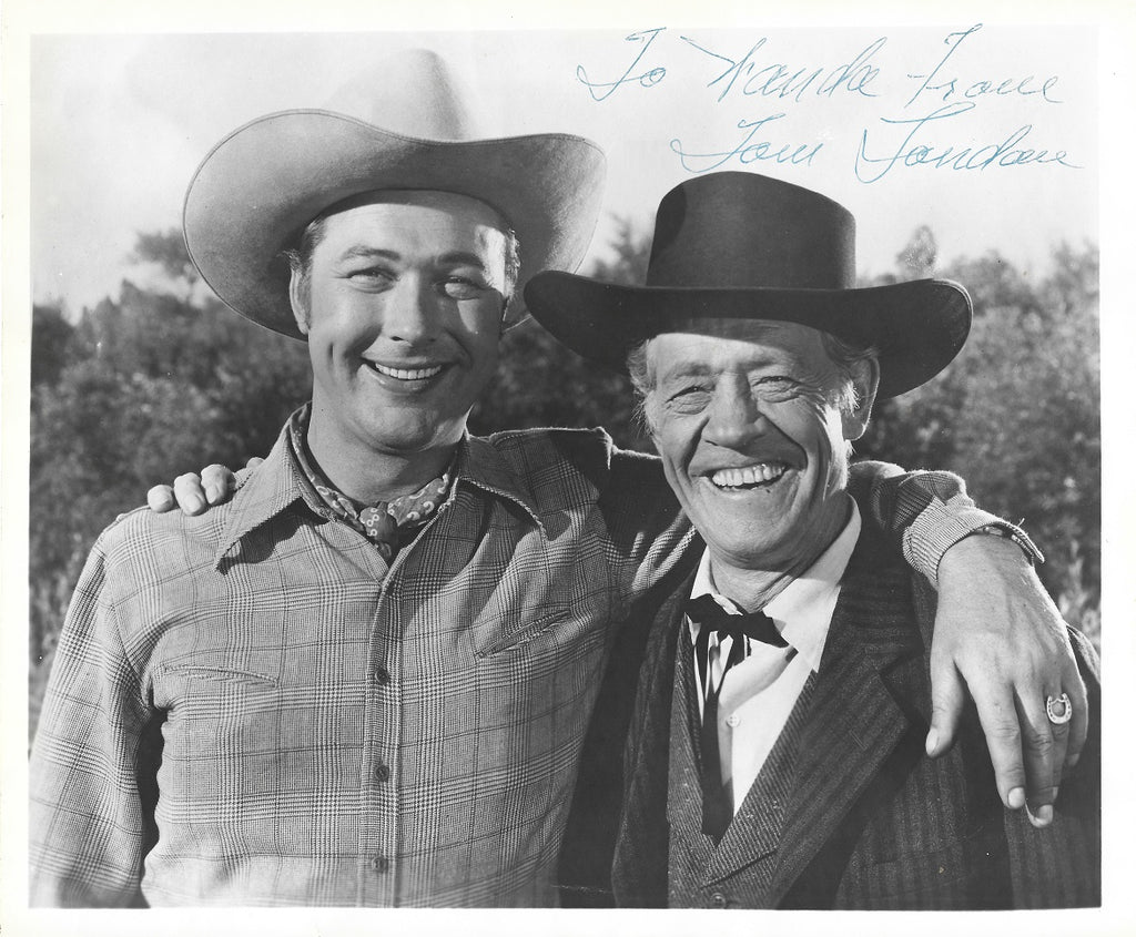 ULTRA-rare vintage 10x8-inch black and white western portrait of the great cowboy movie stuntman and actor who racked up over 650 film and television credits, shown flanked by Tim Holt, probably on the set of Trail Guide (1952), boldly signed and inscribed in blue ballpoint pen in the early 1960s, not long before his death. Just the second example we have ever seen, in good condition, with very slight border crinkling and a minute chip to the lower right-hand corner tip.