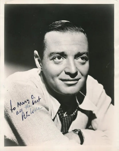Scarce and terrific vintage 8x10-inch black and white portrait, boldly signed and inscribed in blue fountain pen in the early 1940s. In good condition, with minor surface wear. Austrian-American stage and screen star Peter Lorre first garnered critical acclaim as the homicidal Hans Beckert in Fritz Lang’s classic thriller M (1931). Despite his diminutive size and childish face, he always seemed to emit an off-putting, sinister quality, resulting in his being typecast as crooks, deranged scientists and obsessive eccentrics. Among horror, sci-fi and fantasy fans, he is remembered as Dr. Gogol in Mad Love (1935), Professor Fenninger in You’ll Find Out (1940), Baron Ikito in Invisible Agent (1942), Dr. Lorencz in The Boogie Man Will Get You (1942), Dr. Einstein in Arsenic and Old Lace (1944), Hilary Cummins in The Beast with Five Fingers (1946), Conseil in 20,000 Leagues Under the Sea (1954), Commodor Emery in Voyage to the Bottom of the Sea (1961), Montresor in Tales of Terror (1962), Dr. Bedlo in The Raven (1963), and Felix Gillie in The Comedy of Terrors (1963). His countless credits in other film genres included Alfred Hitchcock's The Man Who Knew Too Much (1934) and Secret Agent (1936); The Maltese Falcon (1941); The Face Behind the Mask (1941); Casablanca (1942); and the Mr. Moto mystery series of 1937 through 1939.