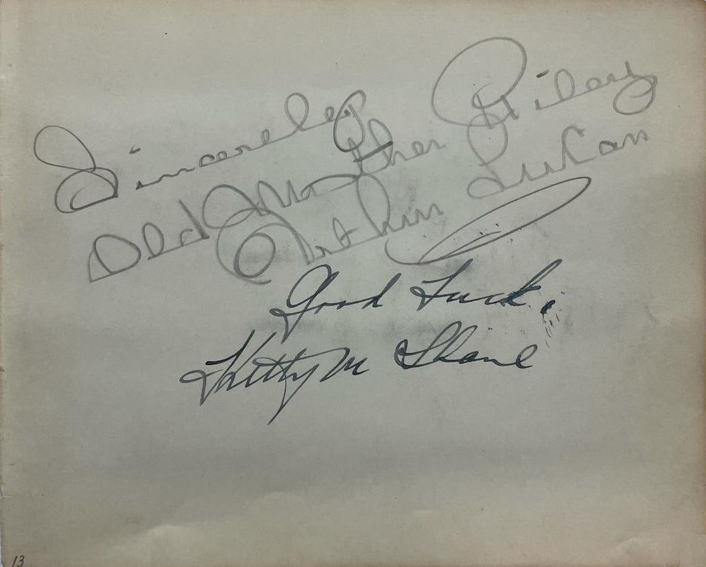 TOUGH to acquire set of vintage signatures on a 4.25 x 6.5-inch grey album page of the cross-dressing "Old Mother Riley" star, who was paired with Bela Lugosi in 1952's Vampire Over London, given in pencil, and his wife, Kitty McShane, who played his daughter in his movies, given in black fountain pen. Acquired in-person following a music hall performance in England in the 1940s. In good condition for its age. Note that the image of the stars shown here alongside the scan of the autographed page is not included.