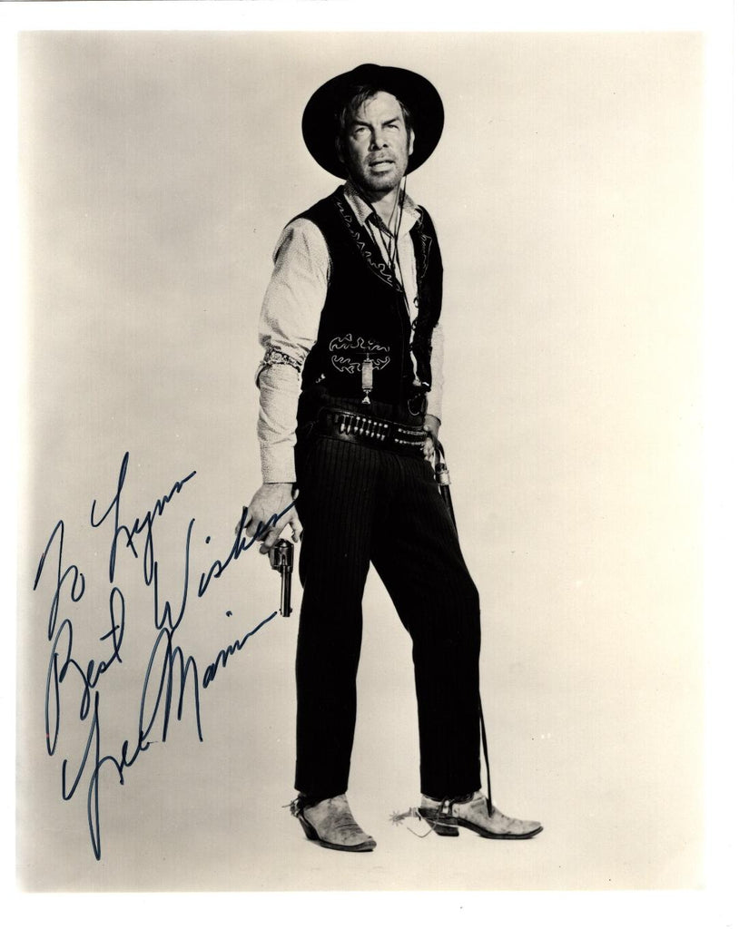 TOUGH to acquire vintage 8x10-inch black and white publicity portrait for John Ford's The Man Who Shot Liberty Valance (1962), boldly signed and inscribed in black felt-tip pen in the late 1960s or early 1970s. No-nonsense tough guy actor Lee Marvin snagged and Oscar for 1965's Cat Ballou. He signed very little before his death at the age of 63.