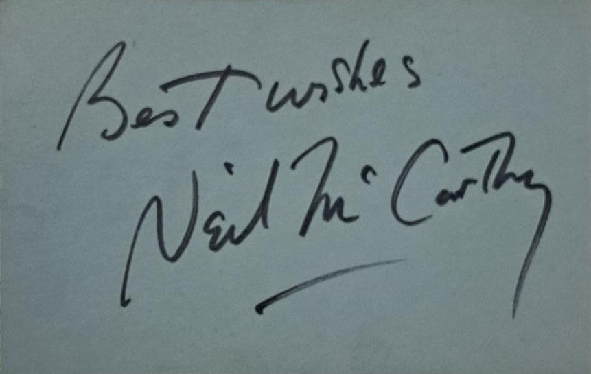 EXTREMELY rare vintage black felt-tip pen signature on a 3.25 x 5.5-inch light green card of the English character actor who starred as disfigured Calibos, the hopeless rival of Perseus for the hand of Andromeda, in 1981's The Clash of the Titans, acquired in-person in the 1980s. This is just the third example we have seen in nearly 40 years. in very good condition. Note that the image of the star shown here alongside the scan of the autograph is not included.
