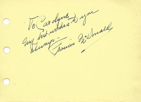 Rare vintage inscribed black fountain pen signature on a 4x6-inch yellow autograph album page, acquired in-person in the 1930s. In good condition and the first we have seen in about 10 years. The remarkable 350-credit career of ubiquitous character actor Francis McDonald spanned the earliest silent films, the silver screen era of sound film and the golden age of television. With his dark hair, mustache, beady eyes, and prominent nose, he was the quintessential exotic ethnic type or sneaky villain, and later, a regular henchman or old codger in big screen and T.V. westerns. Noteworthy films include Black Orchids (1917), Battling Butler (1926) with Buster Keaton, Morocco (1930), Diamond Jim (1935), Mummy's Boys (1936), Born Reckless (1937), The Buccaneer (1938), Juarez (1939), Beau Geste (1939), The Light That Failed (1939), The Sea Wolf (1941), Blood and Sand (1941), Till We Meet Again (1944), Zorro's Black Whip (1944), horror's Strange Confession (1945) and The Catman of Paris (1946), The Invisible Informer (1946), Duel in the Sun (1946), The Three Musketeers (1948), Samson and Delilah (1949), Son of Ali Baba (1952), Calamity Jane (1953), and The Ten Commandments (1956).