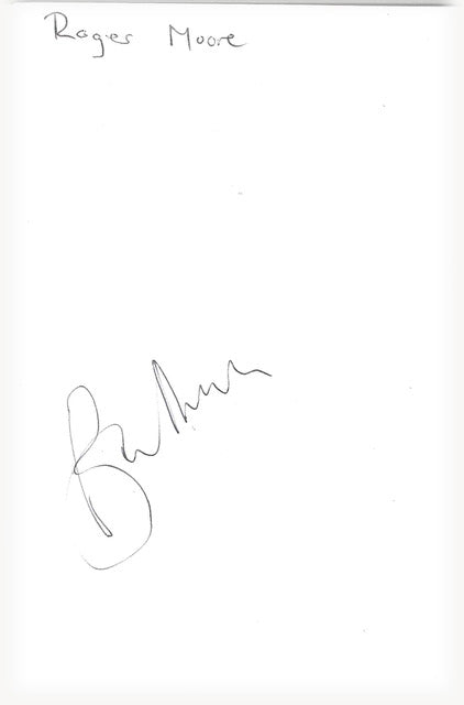 Bold, mattable black ballpoint pen signature on a 5x7-inch sheet of art book paper of the dashing English leading man remembered for portraying James Bond, acquired in-person in London in the 1990s. In good condition, with a few minor crinkles.