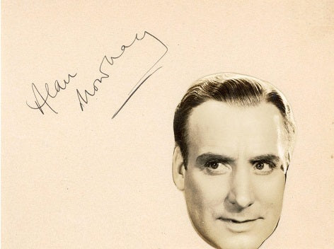 Uncommon vintage black fountain pen signature on a roughly 4x5-inch tan autograph album page, acquired in-person in 1930s and decorated with a small image of the star. In good condition, with slight trimming to the bottom edge, and nice for matting with a favorite photograph. British Alan Mowbray was one of the great character actors of the 1930s through 1950s, playing a mixed bag of pompous authority figures, sterling servants, unsuspected murderers, and slick crooks in films like Alexander Hamilton (1931), Voltaire (1933), Roman Scandals (1933), Charlie Chan in London (1934), The House of Rothschild (1935), Becky Sharp (1935), My Man Godfrey (1936), The Case Against Mrs. Ames (1936), Hal Roach's The Devil with Hitler (1942), My Darling Clementine (1946), Abbott and Costello Meet the Killer, Boris Karloff (1949), Wagonmaster (1950), and Around the World in Eighty Days (1956). He also had the distinction of appearing with three of the actors who portrayed Sherlock Holmes on screen, appearing alongside Clive Brook in Sherlock Holmes (1932); Reginald Owen in A Study in Scarlet (1933), in which he played Lestrade; and Basil Rathbone in Terror by Night (1946).