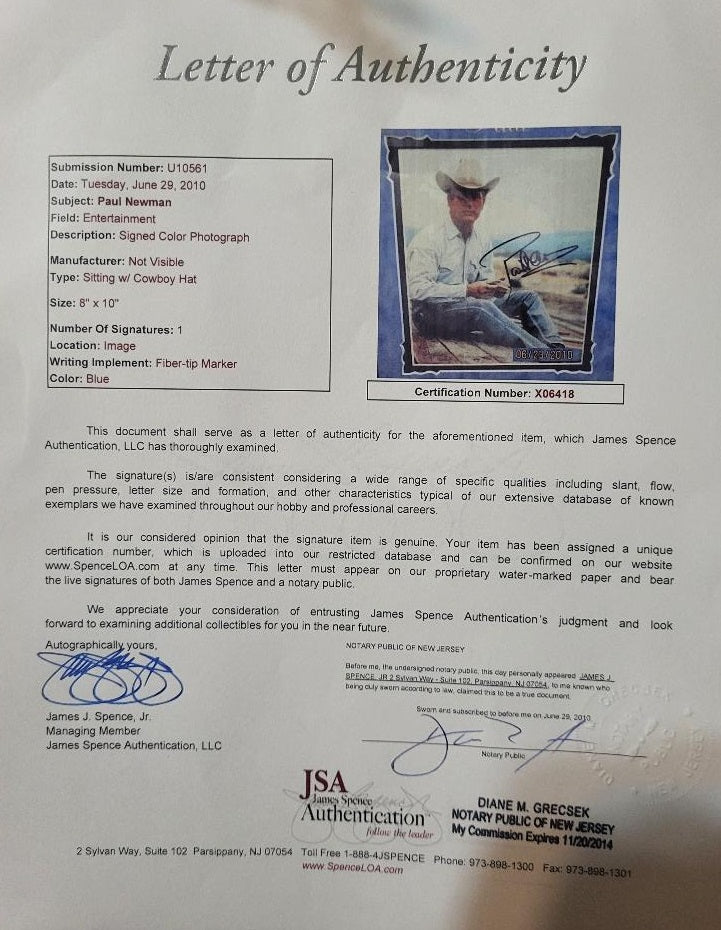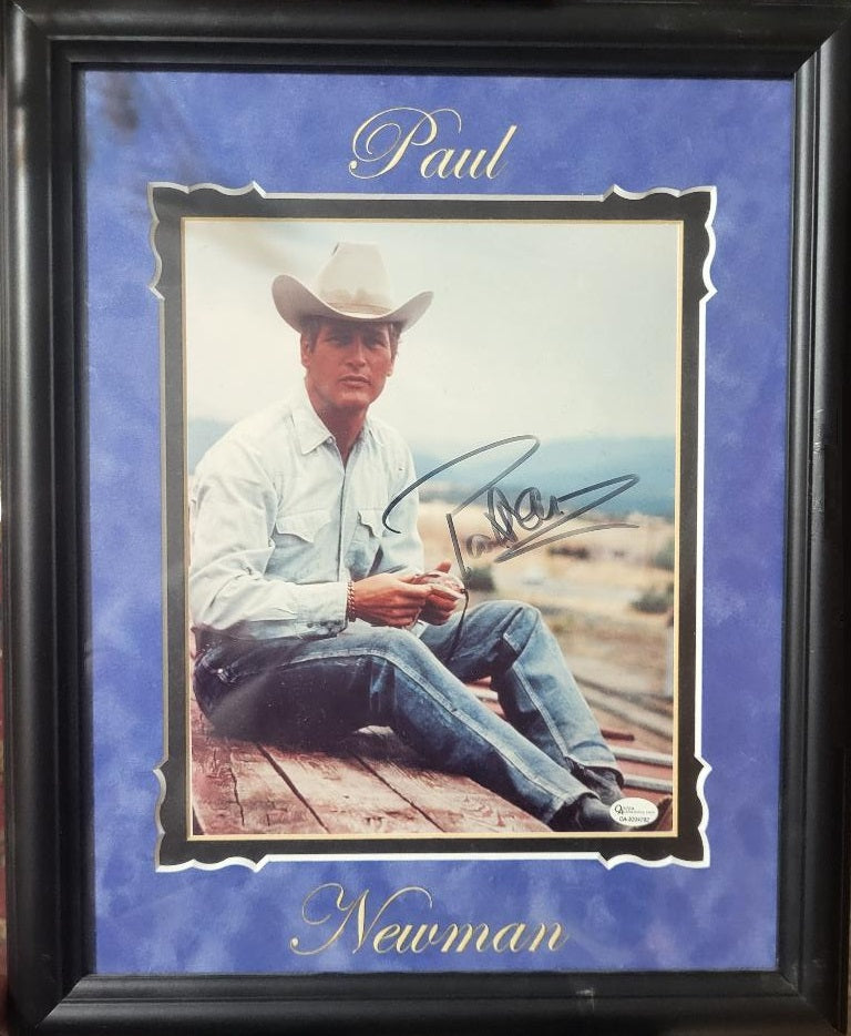 Rare 8x10-inch color publicity portrait in his prime for 1963's Hud, handsomely matted in light blue embossed with his name in yellow, and framed up to an overall size of 11x14 inches. In good condition, never examined outside of its frame, with a small sticker from the third-party authentication company Online Authentics affixed to the lower right-hand corner, as well as a letter of authenticity from another, J.S.A. Impossibly handsome leading man Paul Newman is one of four actors to have been nominated for Oscars in five different decades, alongside Laurence Olivier, Michael Caine and Jack Nicholson. He won for 1987's The Color of Money and was also granted two special Academy Awards, for his humanitarianism and for his overall contributions to the film industry.