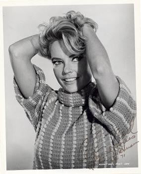 Uncommon 8x10-inch black and white portrait, signed in black felt-tip marker in 1971. In good condition, with some of the writing against the busy stitch-work of her sweater. Beautiful Chris Noel was part of the troupe of beautiful, bikini-clad blondes who romped about in the California surf in beach flicks of the 1960s, most memorably Beach Ball (1965) and Wild, Wild Winter (1965). She went on to slightly more substantive roles in Elvis Presley's Girl Happy (1965) and The Tormentors (1971). In 1969, her husband, traumatized by service in Vietnam, committed suicide, and she thereafter dedicated her time to entertaining troupes in enemy territory. She developed emotional difficulties in the process, further deepened by two unsuccessful marriages, and her career was essentially over by the 1970s. Signed material is rather scarce in any format.