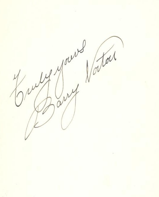 Scarce vintage black fountain pen signature on the verso of a roughly 4.5 x 6.5-inch black and white publicity portrait by Autrey, dating to the early 1930s. In fine condition for its age, with some chipping to the image around the edges and light surface wear. Prior to his tragic death of a heart attack at the age of 51, boyishly handsome Argentine-born silent and early talkie film star Barry Norton played Reginald Van Lear in The Wizard (1927) and Juan Harker in the Spanish-language version of the horror classic Dracula (1931), opposite Lopita Tovar. He also had small roles in Zombies on Broadway (1945), The Strange Door (1951) and The She-Creature (1956). His work in other genres included A Man About Town (1927), Sunrise (1927), Dishonered (1931), Lady for a Day (1933), Imitation of Life (1934), Anna Karenina (1935), The Razor's Edge (1946), The Big Clock (1948), Strangers on a Train (1951), What Price Glory (1952), The Caine Mutiny (1954), A Star Is Born (1954), There's No Business Like Show Business (1954), Ain't Misbehavin' (1955), To Catch a Thief (1955), Around the World in Eighty Days (1956) and Written on the Wind (1956). This is just one of four autographs of the actor we have ever encountered.