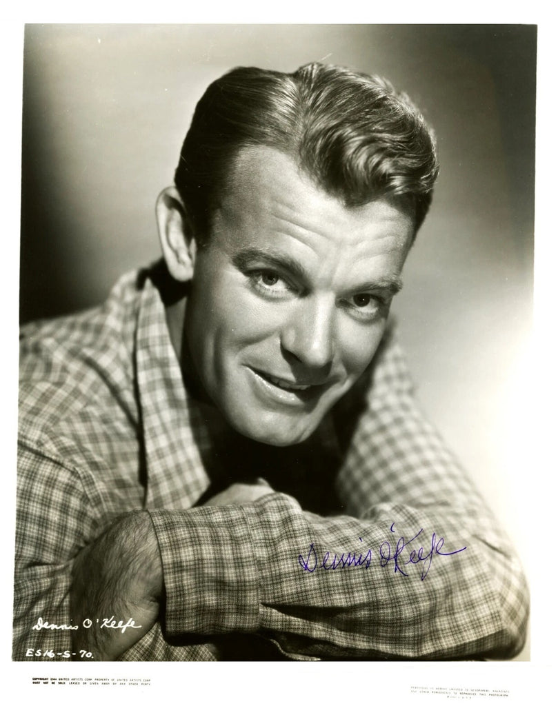 Tough to acquire vintage 8x10-inch black and white portrait, boldly signed in violet fountain pen in the 1940s. In good condition for its age. After notable work in films like You'll Find Out (1940), Lady Scarface (1941), Hangmen Also Die! (1943), and The Leopard Man (1943), handsome leading man Dennis O'Keef died of lung cancer at the age of 60.