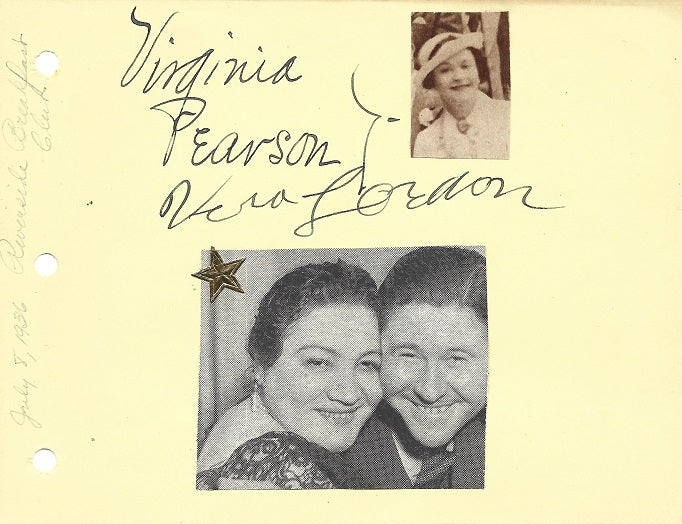 Scarce vintage black fountain pen signature, given above that of character actress Vera Gordon, on a 4x6-inch pale yellow autograph album page, acquired in-person by noted collector Rae Sargent at California's Riverside Breakfast Club in 1936 and decorated with two magazine images. In good condition. Eminent silent movie leading lady-turned-character player Virginia Pearson, notably playing Lady Vishuss in The Wizard of Oz (1925) and Carlotta's mother in The Phantom of the Opera (1925).