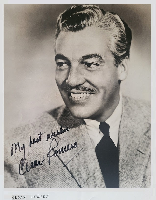 Handsome vintage 8x10-inch black and white portrait, boldly signed in black felt-tip marker in the 1980s. In good condition, with minor handling dings. Tall, suave Cesar Romero had two distinct onscreen personas: To one generation, he was the fiery Latin lover of numerous musicals and romantic comedies; to another, the rogue bandit The Cisco Kid in a string of low-budget westerns, and cackling, villainous Joker on T.V.'s "Batman" (1966-1968), a role he reprised in the 1966 movie. His numerous contributions to the horror, sci-fi, fantasy, and mystery genres included The Shadow Laughs (1933), The Thin Man (1934), Public Enemy's Wife (1936), Ali Baba Goes to Town (1937), Charlie Chan at Treasure Island (1939), The Lady in Ermine (1948), Lost Continent (1951), The Jungle (1952), Scotland Yard Inspector (1952), Around the World in Eighty Days (1956), Two on a Guillotine (1965), Latitude Zero (1969), Target: Harry (1969), Now You See Him, Now You Don't (1972), The Haunted Mouth (1974), The Spectre of Edgar Allan Poe (1974), The Strongest Man in the World (1975), and Judgment Day (1988).