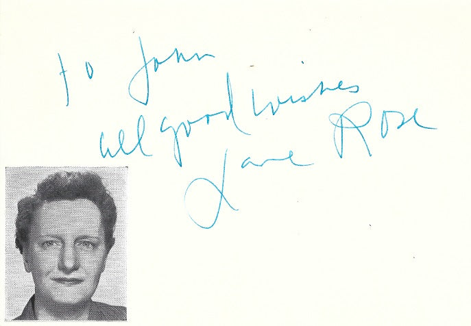 Highly rare vintage inscribed turquoise fountain pen signature on a 4x6-inch off-white card, acquired in-person by indefatigable autograph hound John Virzi in 1961 and decorated with a Players Directory image. In good condition. Great character actress Jane Rose played an unforgettable array of sourpussed old bats and dopey spinsters, popping up on classic episodes of "Dark Shadows" (1966), "All in the Family" (1975) and other programs. She was perhaps most memorable as Cloris Leachman's befuddled mother-in-law on "Phyllis" (1975-1977) and as the replacement Grandmama Addams, following the death of Blossom Rock, in Halloween with the New Addams Family (1977).